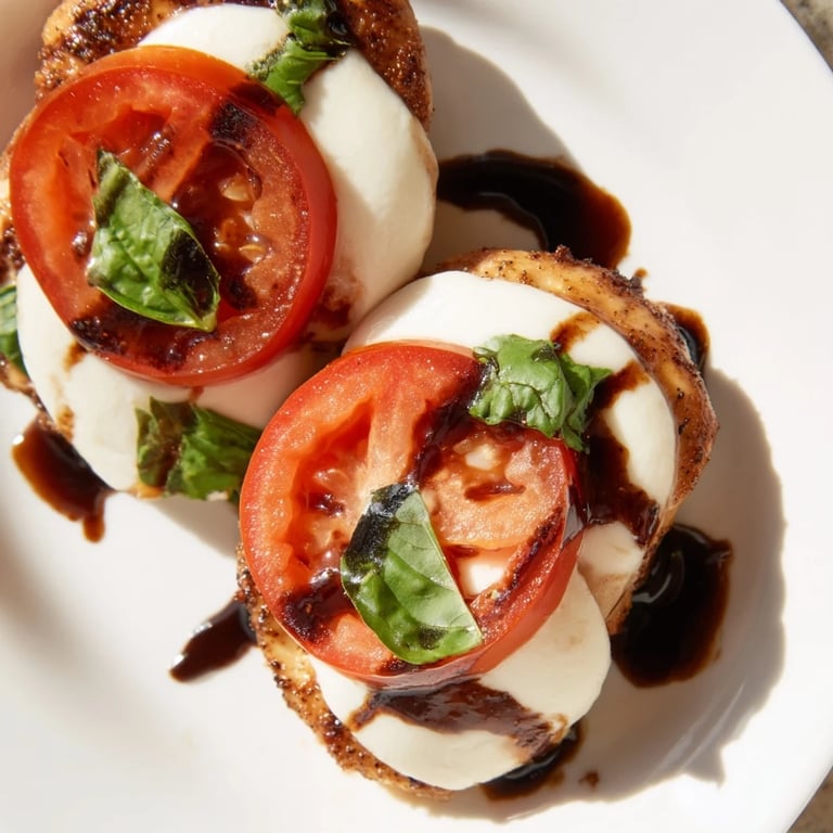 - Tear the fresh basil leaves over the chicken, then drizzle the warm balsamic glaze across everything. Serve immediately while the cheese is still gooey and the glaze is glossy.