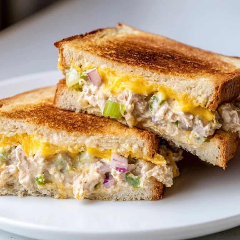 Save A golden, crispy sandwich filled with creamy tuna salad and gooey melted cheese — the perfect quick and satisfying snack.