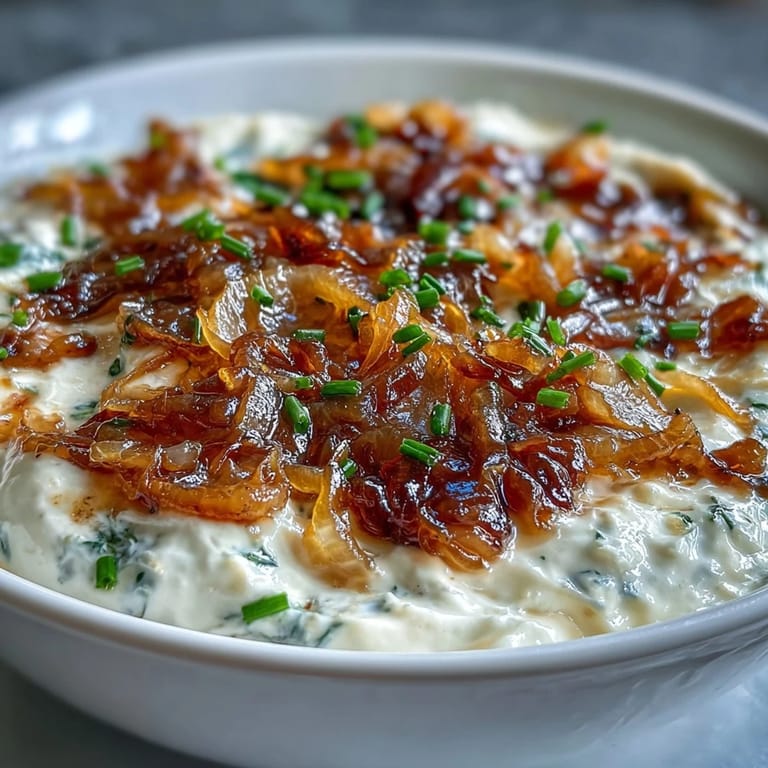 Save There's something almost magical about how patient caramelization transforms humble onions into liquid gold—a lesson I learned the hard way when I first tried rushing the process and ended up with bitter, burnt disappointment instead. Years later, I discovered that Greek yogurt made the perfect canvas for those sweet, jammy onions, creating a dip so creamy and complex that people started asking for the recipe before they'd even finished their first bite. It became my secret weapon at potlucks, the dish that made me look far more impressive in the kitchen than I probably deserved.