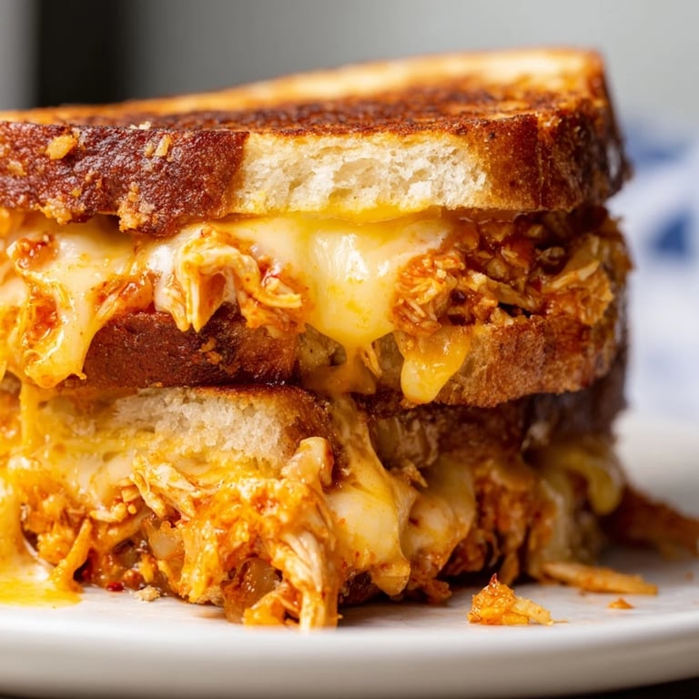 Save I was messing around in the kitchen one rainy afternoon when I accidentally created this monster. I had leftover spicy chicken from the night before and was just trying to make a simple grilled cheese, but then I thought why not both and honestly my life changed a little bit.