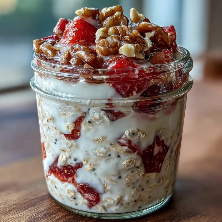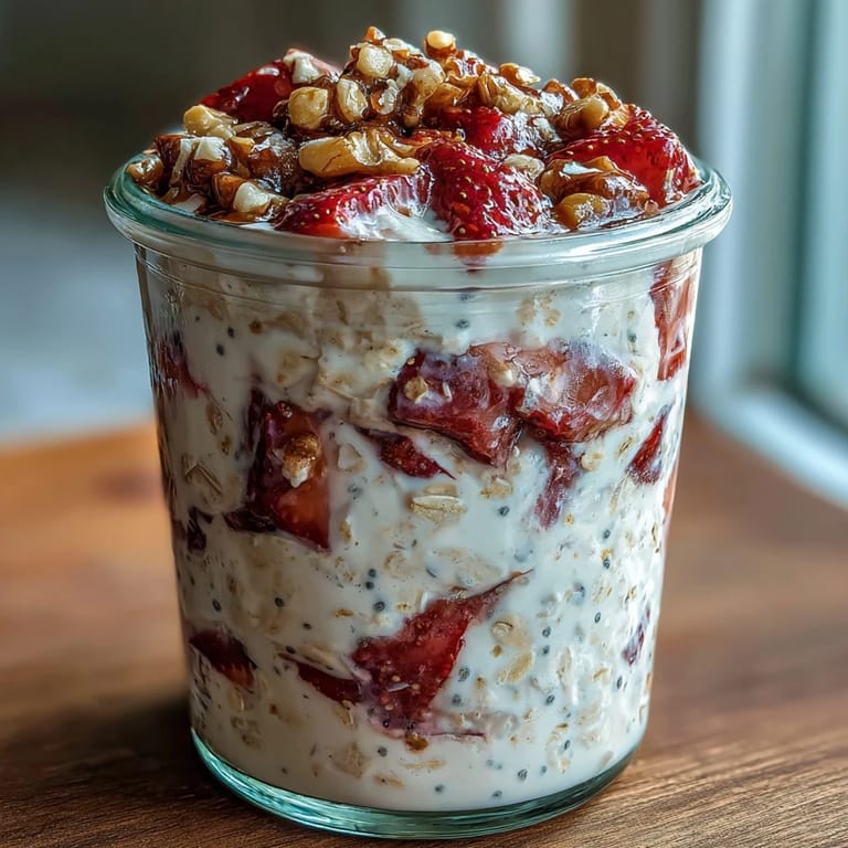 These oats live happily in the fridge for up to three days, which means you can make a double or triple batch on Sunday and wake up to breakfast already waiting Monday, Tuesday, and Wednesday. The strawberries stay surprisingly fresh, the walnuts keep their crunch, and the whole thing tastes like you made it fresh. I've found that keeping them in mason jars makes it feel like you're grabbing something special instead than just opening a container, plus you can eat straight from the jar if you're running late.