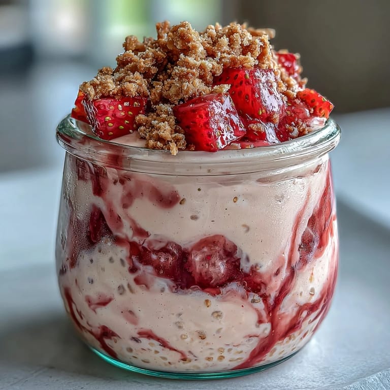 Save Imagine waking up to a breakfast that tastes like dessert but fuels you like a champion. These Strawberry Cheesecake Overnight Oats combine the creamy indulgence of classic cheesecake with the wholesome goodness of oats, fresh strawberries, and a buttery graham cracker crumble that adds the perfect crunch. It's a no-bake treat that practically makes itself while you sleep, ready to greet you with layers of flavor and texture that turn your morning routine into something truly special.
