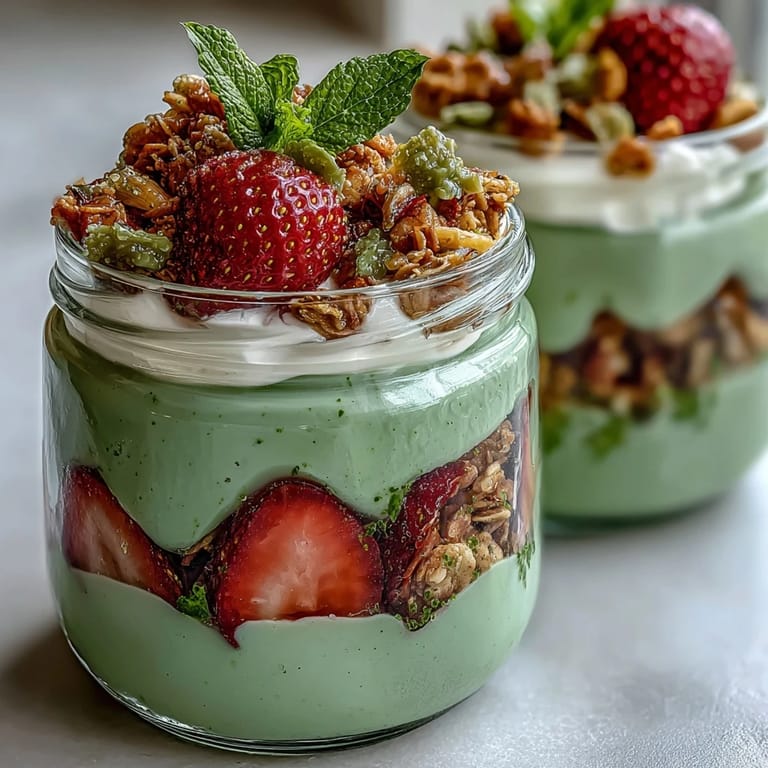 Save Last summer, I was standing in my kitchen on a Tuesday morning, staring at a container of Greek yogurt and wondering how to make breakfast feel less routine. My hands reached for the matcha powder on the shelf—a gift from a friend who'd just returned from Japan—and suddenly I was whisking it into something creamy and green. By the time I'd layered it with fresh strawberries and granola in a clear glass, I realized I'd created something that looked almost too beautiful to eat. My daughter walked in, stopped mid-stride, and asked if we could have this every day. We didn't, but we've come close.