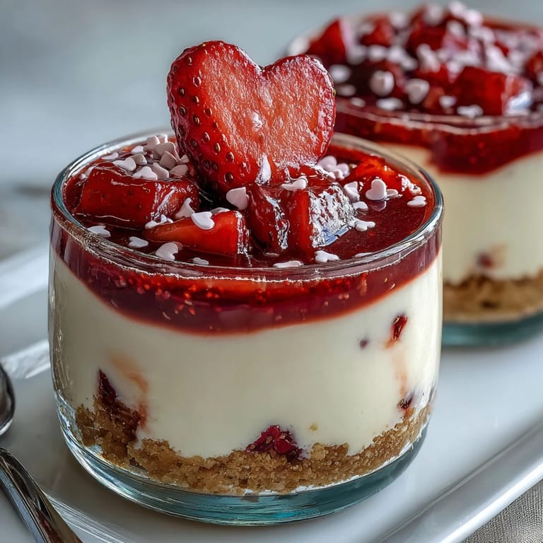 Save My roommate surprised me with a Valentine's Day dinner last year, and I wanted to contribute something special without heating up the kitchen all evening. These strawberry cheesecake cups caught my eye because they felt elegant but honest—no fancy techniques, just layers of buttery sweetness and bright fruit that somehow made the whole evening feel less like a holiday obligation and more like we actually had time for each other.