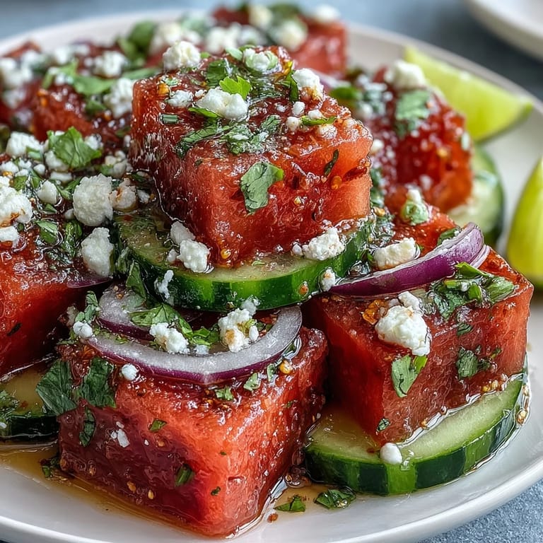 Save The first time I made this watermelon cucumber salad, it was the abrupt sizzle of late July that pushed me to try something lighter—I could practically hear the cicadas cheering me on. My kitchen was alive with the sharp citrus scent of lime and the bold, earthy fragrance of Tajin as I fumbled with the lid, managing to sprinkle half on the counter. The unexpected combo of juicy melon and cool cucumber sent tiny bursts of refreshment in every direction. I was instantly hooked, and honestly, so was everyone who walked through my back door that afternoon.